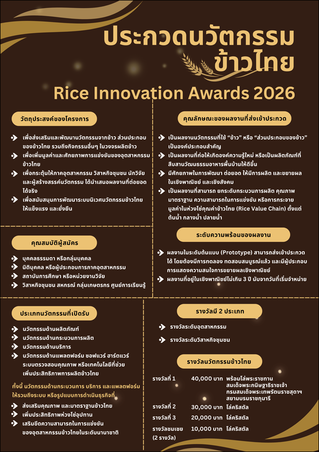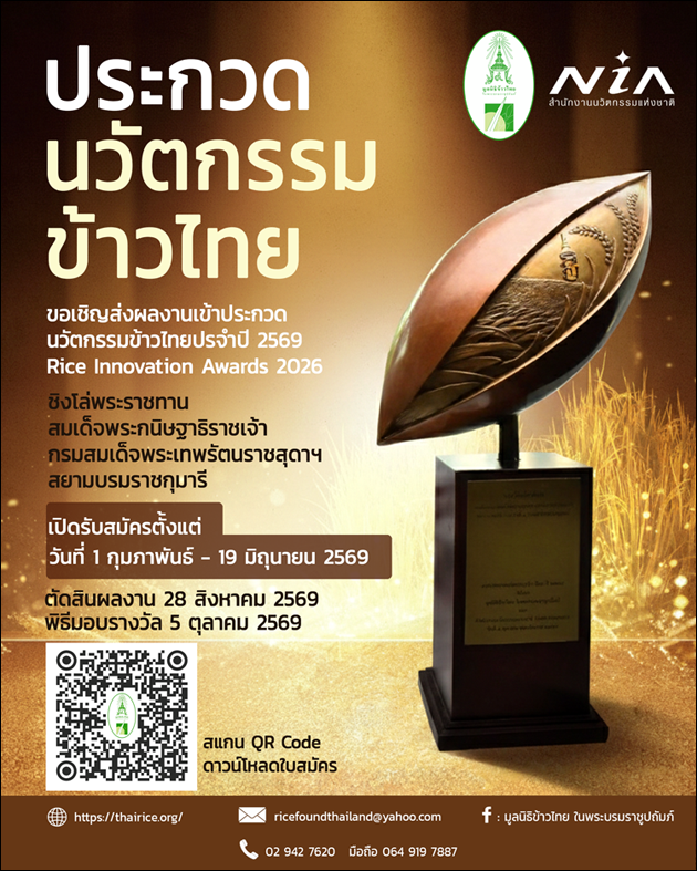 ขอเชิญผู้สนใจ ส่งผลงานเข้าประกวด นวัตกรรมข้าวไทยประจำปี 2569 Rice Innovation Awards 2026 เปิดรับสมัครตั้งแต่ วันที่ 1 กุมภาพันธ์ - 19 มิถุนายน 2569