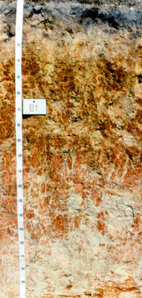 สีน้ำตาลถึงสีเทาปนน้ำตาล พบจุดประสีแดงของศิลาแลงอ่อนและพบชั้นดินที่แสดงถึงความไม่ต่อเนื่องทางธรณี