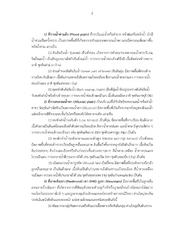 1) ที่ราบน้ำท่วมถึง (Flood plain) ที่ราบริมแม่น้ำหรือลำธาร หน้าฝนหรือหน้าน้ำ มักมี