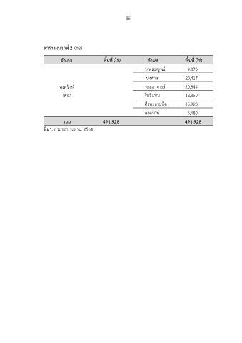 35 ตารางผนวกที่ 2 (ต่อ) อำเภอ พื้นที่ (ไร่) ตำบล พื้นที่ (ไร่) บางสมบูรณ์ 9,875 บึงศาล 20,417 องครักษ์ พระอาจารย์ 20,544 (ต่อ) โพธิ์แทน 12,850 ศีรษะกระบือ 45,923 องครักษ์ 5,480 รวม 491,928 491,928 ที่มา: กรมชลประทาน, 2564