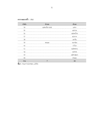 31 ตารางผนวกที่ 1 (ตอ) ลําดับ อําเภอ ตําบล 34 แมสะเรียง (ตอ) แมคง 35 แมยวม 36 แมสะเรียง 37 แมเหาะ 38 เสาหิน 39 สบเมย กองกอย 40 ปาโปง 41 แมคะตวน 42 แมสวด 43 แมสามแลบ 44 สบเมย รวม 7 44 ที่มา: กรมการปกครอง, 2556