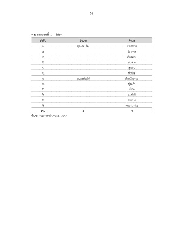 32 ตารางผนวกที่ 1 (ตอ) ลําดับ อําเภอ ตําบล 67 สุงเมน (ตอ) พระหลวง 68 รองกาศ 69 เวียงทอง 70 สบสาย 71 สูงเมน 72 หัวฝาย 73 หนองมวงไข ตําหนักธรรม 74 ทุงแคว 75 น้ํารัด 76 แมคํามี 77 วังหลวง 78 หนองมวงไข รวม 8 78 ที่มา: กรมการปกครอง, 2556