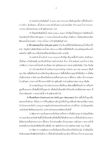 (2) สวนต่ำของสันดินริมน้ำ (Lower part of levee) เปนดินลุม มีสภาพพื้นที่คอนขาง