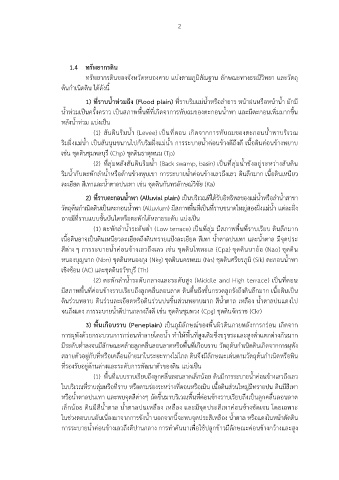 1) ที่ราบน้ำทวมถึง (Flood plain) ที่ราบริมแมน้ำหรือลำธาร หนาฝนหรือหนาน้ำ มักมี