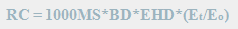 Annual runoff (Q) is calculated using a relational equation between annual rainfall (R; mm), mean rainy day (RO; mm) and moisture storage capacity. Soil moisture storage capacity (RC; mm) is in turn a function of bulk density (BD; mg/m3), soil moisture content at field capacity (MS; %ww), effective hydrological depth (EHD; m), and ratio of actual to potential evapotranspiration (ET/EO). The equations below show the computation of soil moisture storage capacity; |