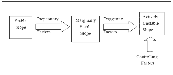 Landslides have several causes or causal factors and these include geological, morphological, physical and human factors. These factors are also referred to as destabilising (Crozier 1986; Wieczorek 1996). These factors can be classified into three main groups: preparatory, triggering and controlling (perpetuating) factors(Crozier 1986). Preparatory factors factors (like rock type, soil texture etc.,) that make the slope susceptible to movement without actually initiating it and thereby tending to place the slope in a marginally stable state. Triggering factors like earthquakes, intense rainfall, volcanic eruption etc., initiate the movement and shift the slope from marginally stable to an actively unstable state. The controlling or perpetuating factors (like topography, etc.,) determine the condition of movement as it takes place. These factors control the form, rate and duration of mass movement.