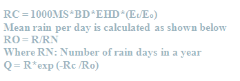| Annual runoff (Q) is calculated using a relational equation between annual rainfall (R; mm), mean rainy day (RO; mm) and moisture storage capacity. Soil moisture storage capacity (RC; mm) is in turn a function of bulk density (BD; mg/m3), soil moisture content at field capacity (MS; %ww), effective hydrological depth (EHD; m), and ratio of actual to potential evapotranspiration (ET/EO). The equations below show the computation of soil moisture storage capacity; |