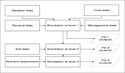 | PS 123 is a biophysical crop growth simulation model which predicts yields under several production levels based on basic plant physiology and soil process. Simulation could start with simple models of control production situation (high confidence on model result) and then increase the complexity for less controlled situation having less confidence in the outcome. The sub model (PS2) has ability to simulate the dry matter yield with different degrees of salinity having effect on osmotic potential Therefore, it is used to simulate the crop growth and yield. The three production situation of the model such as biophysical production potential (temperature and radiation limited), water limited production potential and nutrient limited production potential,explained by Dressen and Konijn (1992). |