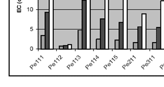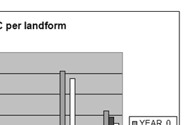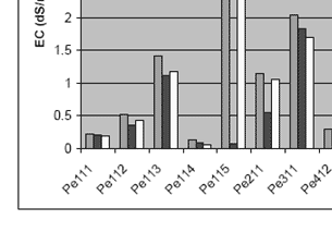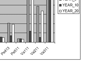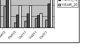 | The root-zone refers to the first two upper soil depth (0-30 and 30 -60cm) of which the average values have been used for input as these layers were measured separately. The results of the predicted root-zone salinity (EC_dS/m) are given in table 1. with the trend showing an increase in salinity from the first year through to the twentieth year. However, some of the landform units show some kind of decrease in the third year (notably Pe111, Va211 & Va311) but finally increased for the tenth and twentieth year. In general the model projects an increase in soil salinity for all the land forms provided that the current land use practices are maintained. Graphical presentation of these results based on relief units is given in figure. |
