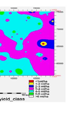 | Figure shows the maize yield map resulted from relationship between salinity and total dry mass. Maize yield estimated higher in depression and its periphery. Yield collected from the farmers are closely related with estimated yield. Generally, yield from farmers field varied from 4 to 6 mt/ha which correlate well with yield map obtained from the simulation. Farmers express yield in average that could not be used to validate the results. |