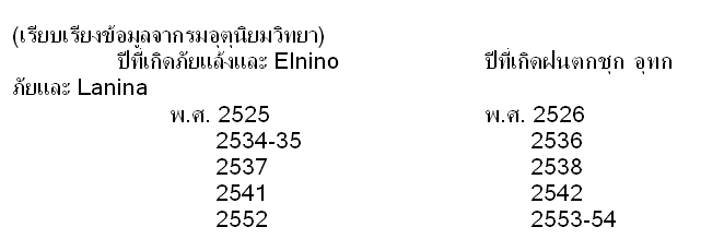 ภาวะผิดปกติของภูมิอากาศจะปรากฏเป็นบางช่วงเวลา ยาวนาน 1-3 ปี องค์ประกอบควบคุมบางตัวมีบทบาทที่ผิดปกติ เช่น ลมมรสุมตะวันตกเฉียงใต้(ลมมรสุมฤดูร้อนที่ทำให้ฝนตกกระจายทั่วประเทศ) อ่อนแรงหรือรุนแรงขึ้น ร่องมรสุม (ร่องฝนที่เกิดจากแนวบรรจบของลมมรสุมตะวันตกเฉียงใต้กับลมมรสุมตะวันออกเฉียงเหนือ) เปลี่ยนตำแหน่งพาดผ่านเร็วหรือหยุดนิ่งอยู่ในพื้นที่เดิมนานๆ หลายๆวัน พายุหมุนเขตร้อนเกิดขึ้นในพื้นที่มหาสมุทรแปซิฟิกตะวันตกแล้วเคลื่อนสู่ประเทศไทย มากหรือน้อยกว่าปกติ ความไม่ปกติทำให้ประเทศไทยประสบกับภาวะฝนตกน้อย ฝนแล้งจัด ขาดแคลนน้ำรุนแรง หรือผิดปกติในทางตรงกันข้าม ฝนตกชุกมาก น้ำท่วมใหญ่