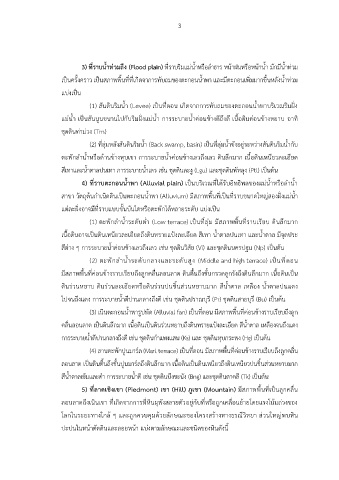 3) ที่ราบน้ำท่วมถึง (Flood plain) ที่ราบริมแม่น้ำหรือลำธาร หน้าฝนหรือหน้าน้ำ มักมีน้ำท่วม