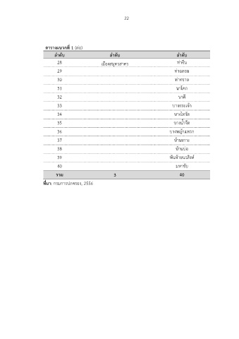 22 ตารางผนวกที่ 1 (ต่อ) ลำดับ ลำดับ ลำดับ 28 เมืองสมุทรสาคร ท่าจีน 29 ท่าฉลอม 30 ท่าทราย 31 นาโคก 32 นาดี 33 บางกระเจ้า 34 บางโทรัด 35 บางน้ำจืด 36 บางหญ้าแพรก 37 บ้านเกาะ 38 บ้านบ่อ 39 พันท้ายนรสิงห์ 40 มหาชัย รวม 3 40 ที่มา: กรมการปกครอง, 2556