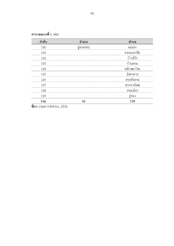 42 ตารางผนวกที่ 1 (ต่อ) ลำดับ อำเภอ ตำบล 100 อู่ทอง(ต่อ) ดอนคา 101 ดอนมะเกลือ 102 บ้านโข้ง 103 บ้านดอน 104 พลับพลาไชย 105 ยุ้งทะลาย 106 สระพังลาน 107 สระยายโสม 108 หนองโอ่ง 109 อู่ทอง รวม 10 109 ที่มา: กรมการปกครอง, 2556