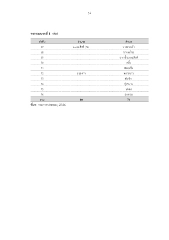 39 ตารางผนวกที่ 1 (ต่อ) ล าดับ อ าเภอ ต าบล 67 แหลมสิงห์ (ต่อ) บางสระเก้า 68 บางกะไชย 69 ปากน้ าแหลมสิงห์ 70 พลิ้ว 71 หนองชิ่ม 72 สอยดาว ทรายขาว 73 ทับช้าง 74 ทุ่งขนาน 75 ปะตง 76 สะตอน รวม 10 76 ที่มา: กรมการปกครอง, 2564