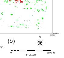 | Figure 2 : Showing an overlay of the ortho photo on the test area of the ASTER image to show that the two did not have a perfect match (a) and (b) showing an overlay of landslide boundaries from aerial photo interpretation on the classification results (bands 2,3 and 4) from digital image analysis. |