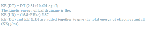 | Kinetic energy is then calculated for effective rainfall of leaf drainage (KE (LD); j/m2) and effective rainfall of direct through fall (KE (DT); j/m2). KE (LD) and KE (DT) are a function of plant height (PH) and intensity (I) respectively. Kinetic energy of direct through fall is computed as follows. |