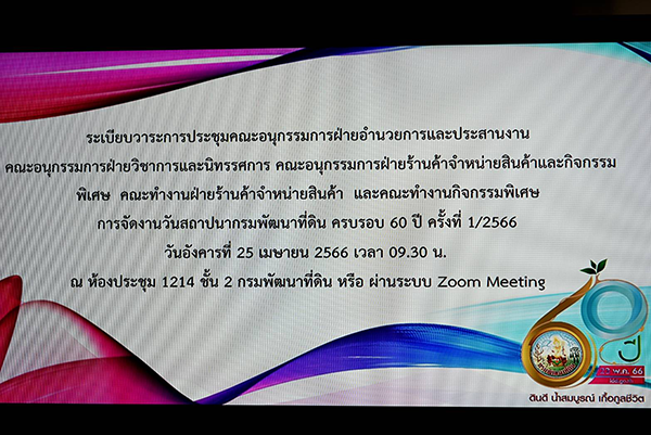 วันอังคารที่ 25 เมษายน พ.ศ. 2566 เวลา 09.30 น. นายอาทิตย์ ศุขเกษม รองอธิบดีกรมพัฒนาที่ดิน ด้านปฏิบัติการ เป็นประธานการประชุมคณะอนุกรรมการฝ่ายอำนวยการและประสานงาน คณะอนุกรรมการฝ่ายวิชาการและนิทรรศการ คณะอนุกรรมการฝ่ายร้านค้าจำหน่ายสินค้าและกิจกรรมพิเศษ คณะทำงานฝ่ายร้านค้าจำหน่ายสินค้า และคณะทำงานกิจกรรมพิเศษ การจัดงานวันสถาปนากรมพัฒนาที่ดิน ครบรอบ 60 ปี ครั้งที่ 1/2566 โดยมีคณะอนุกรรมการ ทั้ง 3 คณะ คณะทำงาน และเจ้าหน้าที่ที่เกี่ยวข้องเข้าร่วมประชุม ณ ห้องประชุม 1214 ชั้น 2 อาคาร 1 กรมพัฒนาที่ดิน เขตจตุจักร กรุงเทพฯ และผ่านระบบออนไลน์ Zoom Meeting โดยที่ประชุมร่วมกันพิจารณากำหนดรูปแบบและกิจกรรมการจัดงานวันสถาปนากรมพัฒนาที่ดิน ครบรอบ 60 ปี ซึ่งกำหนดจัดงานระหว่างวันที่ 23 - 24 พฤษภาคม พ.ศ. 2566 ในหัวข้อ กรมพัฒนาที่ดิน 60 ปี “ดินดี น้ำสมบูรณ์ เกื้อกูลชีวิต” รวมทั้งพิจารณาแผนงาน/กิจกรรม งบประมาณที่ใช้ในการจัดงาน ทั้งนี้ เพื่อให้การจัดงานวันสถาปนากรมพัฒนาที่ดินเป็นไปด้วยความเรียบร้อย และบรรลุวัตถุประสงค์