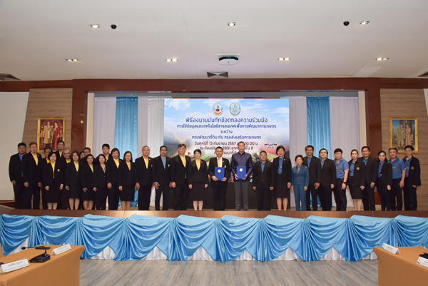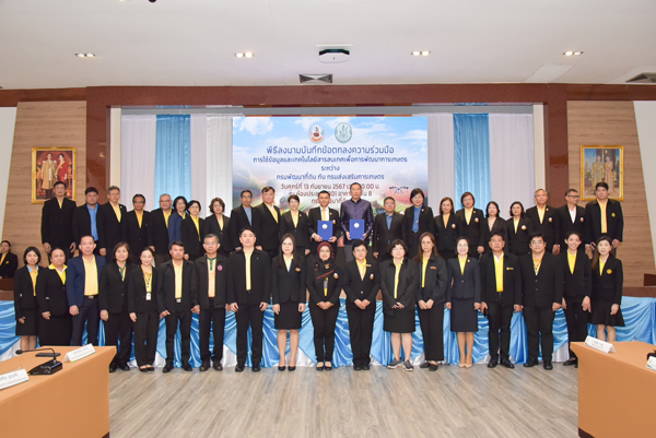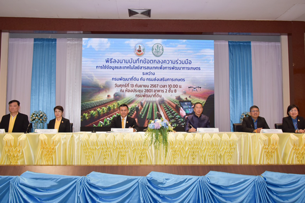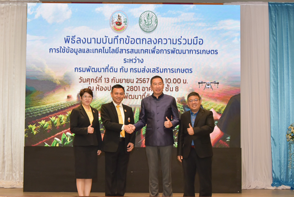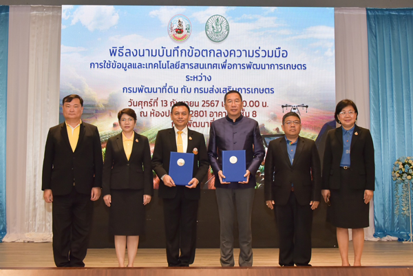 วันศุกร์ที่ 13 กันยายน พ.ศ. 2567 เวลา 09.30 น. นายอนุวัชร โพธินาม รองอธิบดีกรมพัฒนาที่ดินด้านปฏิบัติการ ได้รับมอบหมายจาก นายปราโมทย์ ยาใจ อธิบดีกรมพัฒนาที่ดิน เป็นประธานในพิธีลงนามในบันทึกข้อตกลงความร่วมมือ การใช้ข้อมูลและเทคโนโลยีสารสนเทศเพื่อการพัฒนาการเกษตร ระหว่าง กรมพัฒนาที่ดิน กับ กรมส่งเสริมการเกษตร โดยมีนายพีรพันธ์ คอทอง อธิบดีกรมส่งเสริมการเกษตร ร่วมลงนามในบันทึกข้อตกลงฯ พร้อมด้วย นางสาวสุมิตรา วัฒนา รองอธิบดีกรมพัฒนาที่ดินด้านบริหาร นายครองศักดิ์ สงรักษา รองอธิบดีกรมส่งเสริมการเกษตร นายอัธยะ พินจงสกุลดิษฐ ผู้อำนวยการศูนย์เทคโนโลยีสารสนเทศและการสื่อสาร กรมพัฒนาที่ดิน และนางสาวสุรางค์ศรี วาเพชร ผู้อำนวยการศูนย์เทคโนโลยีสารสนเทศและการสื่อสาร กรมส่งเสริมการเกษตร ลงนามเป็นพยาน ผู้อำนวยการกอง/สำนัก คณะผู้บริหารและเจ้าหน้าที่ของทั้งสองฝ่าย เข้าร่วมเป็นสักขีพยาน ณ ห้องประชุม 2801 ชั้น 8 อาคาร 2 กรมพัฒนาที่ดิน เขตจตุจักร กรุงเทพฯ
