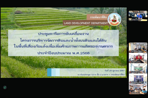 วันศุกร์ที่ 25 ตุลาคม พ.ศ. 2567 เวลา 11.00 น. นายอาทิตย์ ศุขเกษม รองอธิบดีกรมพัฒนาที่ดินด้านวิชาการ รักษาราชการแทนอธิบดีกรมพัฒนาที่ดิน เป็นประธานการประชุมหารือขับเคลื่อนงานโครงการบริหารจัดการดินและน้ำทั้งบนดินและใต้ดินในพื้นที่ภัยแล้ง เพื่อเพิ่มศักยภาพการผลิตของเกษตรกร ประจำปีงบประมาณ พ.ศ. 2568 โดยมี นางสาวสุมิตรา วัฒนา รองอธิบดีกรมพัฒนาที่ดินด้านบริหาร นายวิศิษฐ์ งามสม นักวิเคราะห์นโยบายและแผนชำนาญการพิเศษ คณะทำงานโครงการบริหารจัดการดินและน้ำทั้งบนดินและใต้ดินฯ ผู้อำนวยการ/ผู้แทนจากส่วนกลาง สำนักงานพัฒนาที่ดินเขต และสถานีพัฒนาที่ดินจังหวัด ข้าราชการและเจ้าหน้าที่ผู้เกี่ยวข้อง เข้าร่วม ณ ห้องประชุม 1214 ชั้น 2 อาคาร 6 ชั้น กรมพัฒนาที่ดิน เขตจตุจักร กรุงเทพฯ และผ่านระบบการประชุมอิเล็กทรอนิกส์ด้วยโปรแกรม Zoom Meeting เพื่อติดตามผลการดำเนินงานโครงการฯ ปีงบประมาณ พ.ศ. 2567 โดยที่ประชุม ได้มีการหารือถึงแนวทางการดำเนินงานต่าง ๆ เพื่อให้การดำเนินงานโครงการบริหารจัดการดินและน้ำทั้งบนดินและใต้ดินฯ ในปีงบประมาณ พ.ศ. 2568 มีประสิทธิภาพ สามารถกักเก็บน้ำไว้ใช้ในพื้นที่การเกษตร เพื่อเพิ่มศักยภาพการผลิตของเกษตรกร