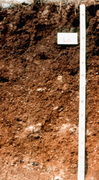 สีน้ำตาลปนแดงหรือสีแดง ปฏิกิริยาดินเป็นด่างปานกลาง