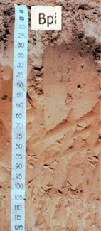 สีน้ำตาลอ่อน ถัดลงไปเป็นดินทรายปนดินร่วน สีเทาปนชมพู