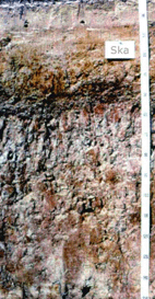 (ปนกรวด) สีเทาหรือเทาปนน้ำตาล จะพบจุดประสีเหลืองปนแดง