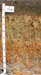 มีสีเทา มีจุดประสีน้ำตาลและสีแดงของศิลาแลงอ่อน (plinthite)