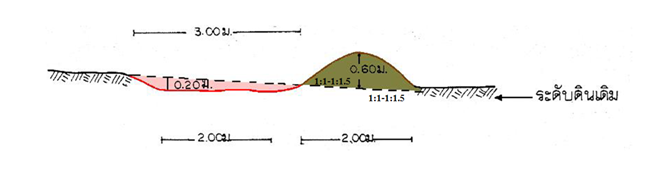 คันดินแบบที่ 2 เป็นคันดินเก็บกักน้ำ ควรใช้กับพื้นที่ดินร่วนปนทราย