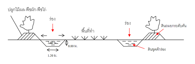 ร่องน้ำที่ขุดมีวัตถุประสงค์เพื่อเก็บกักน้ำ ระบายน้ำและส่งน้ำในแปลงปลูกพืช