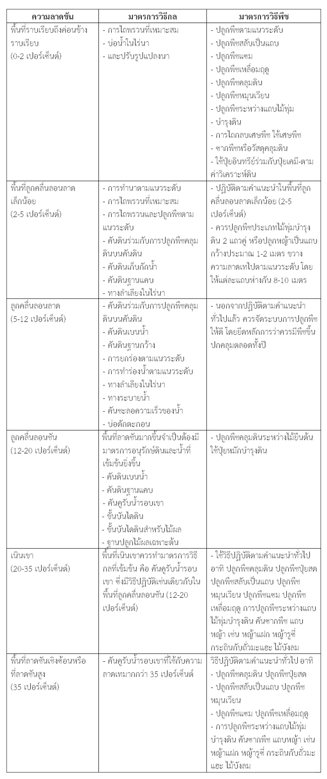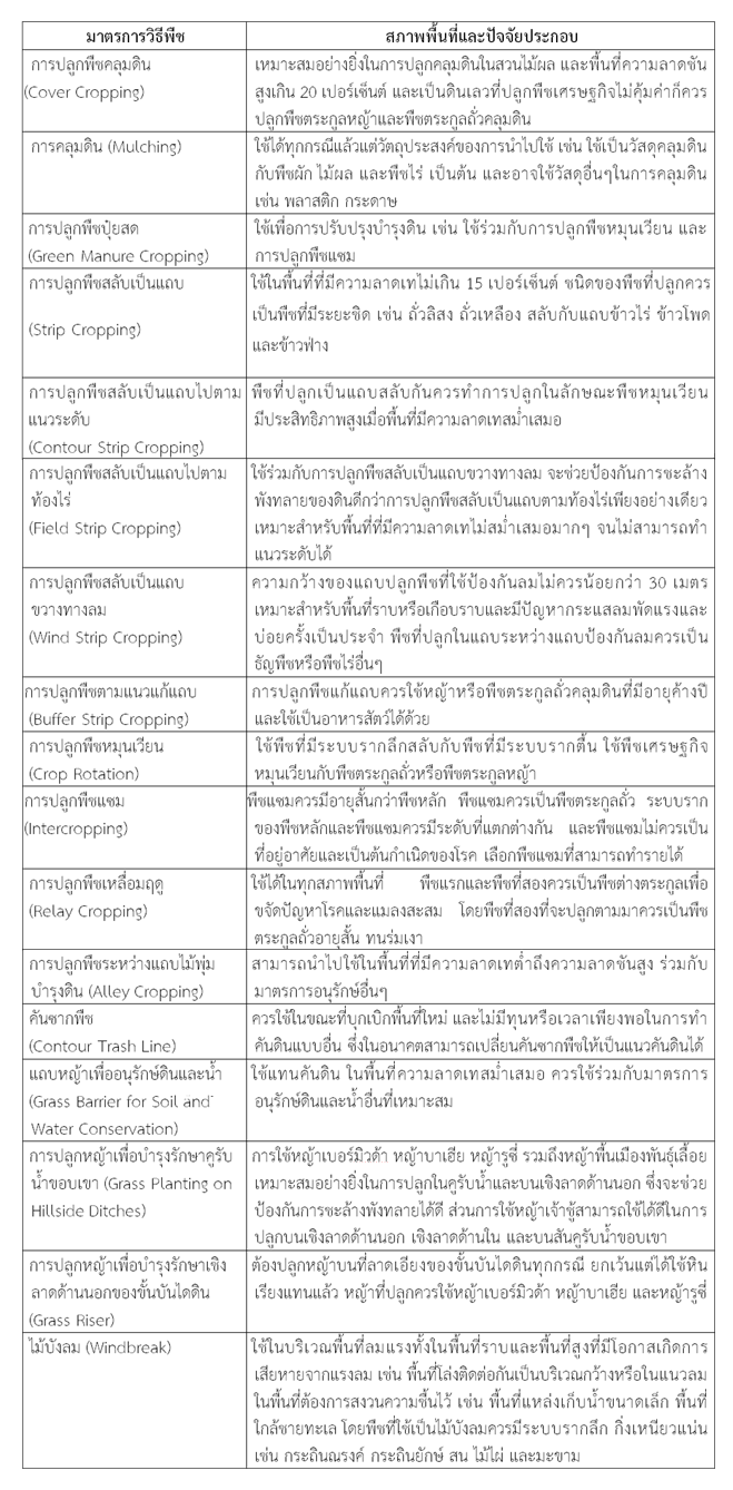 การใช้มาตรการอนุรักษ์ดินและน้ำทั้งมาตรการวิธีกลและมาตรการวิธีพืชที่เหมาะสมตามความลาดชัน
