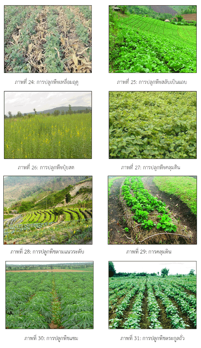 หรือปลูกคลุมดิน หรือการใช้ระบบการปลูกพืชแบบผสมผสาน เพื่อลดความแรงของเม็ดฝน